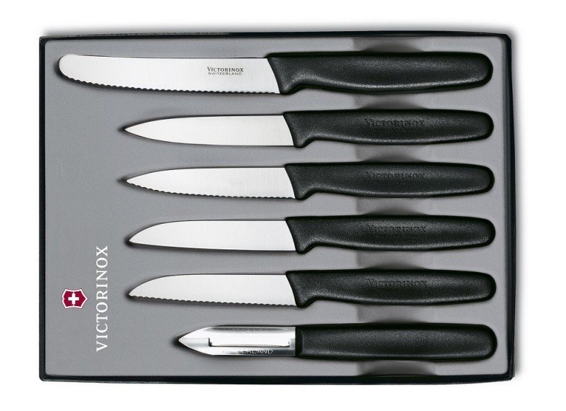 Súprava pozostáva zo škrabky, 2 ks nožov na zeleninu s hladkou čepeľou, 2ks nožov na zeleninu so zúbkovanou čepeľou a noža na paradajky.